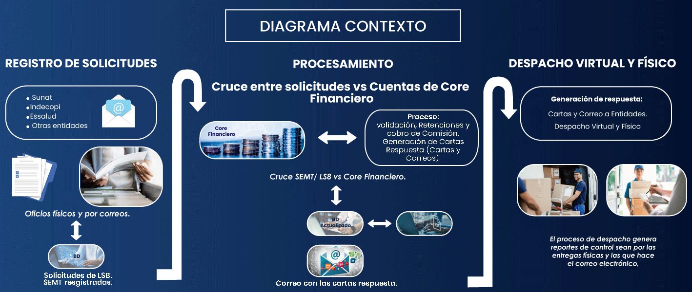 Procesa en forma automática las notificaciones electrónicas y las físicas. El sistema permite formatear los archivos adjuntos, de modo que en el futuro se procesen sin participación del usuario. Ejecuta una interface con el Core Financiero, recibiendo tres (3) respuestas: No es cliente. Cliente sin saldo disponibles. Se ha efectuado las retenciones, el sistema registra las retenciones por cuenta, para la entidad notificadora se le informa el total retenido. Emite respuestas en los registros de notificación o en cartas que son configuradas por los usuarios de la institución financiera.